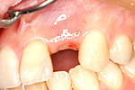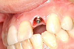 ① 前歯1本が無い状態です。通常は前後の2本の歯を削ってブリッジにしますが、インプラントをすることにより、健康な歯を削る必要はなくなります。