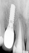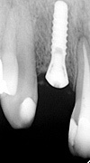 ① 前歯1本がないところにインプラントを埋め込んだレントゲン写真です。