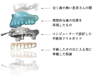 ベストと思われるインプランとの種類、長さ、深さ、角度などをシュミレーションします。色々なチェック項目をクリアした後に、手術に使用する外科用ガイドを作成します。そのガイドを使用して、手術当日には仮歯まで準備されます。手術したその日から、固定式の仮歯が入れられますが、食事は1~2ヶ月間は、極々やわらかいものを採っていただく必要があります。骨の質が悪い場合には、即日に固定式の仮歯が入れられない場合があります。